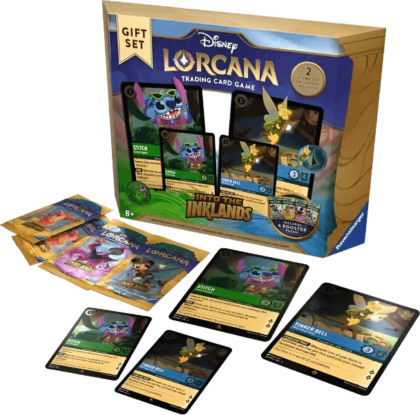 SMALL HEROS, BIG ATTITUDES Outshine opponents with this gift set! Foil cards featuring Stitch and Tinker Bell bring new options to your decks, and the oversized foil versions are fun to collect and display. STITCH – COVERT AGENT Just a friendly fellow enjoying a holiday . . . or is it? This elusive secret agent knows how to hide in plain sight, making him hard to pin down. Once anyone realizes there’s something familiar about him, he’s nowhere to be found! TINKER BELL – VERY CLEVER FAIRY This resourceful fairy helps keep you moving as you race across the Inklands! Using elbow grease along with a little pixie dust, she knows how to make the most of every item—even your lost and broken ones. You also get 4 booster packs, plus tracker tokens featuring Stitch and Tinker Bell art. Each player needs a Disney Lorcana deck of at least 60 cards to play.
