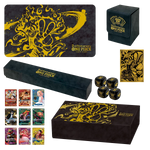The set includes 9 cards, 1 storage box, 1 playmat, 1 card case, 1 playmat case, 4 dice, and a set of card sleeves containing 70 sleeves.